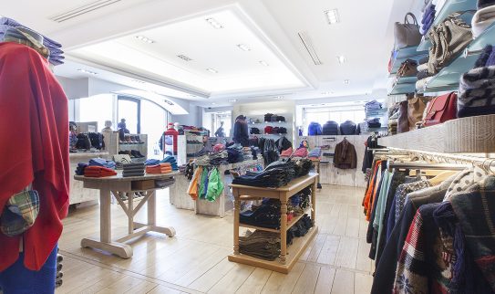 Situated in the animated rue Docteur Paccard, near the Chanel boutique, this Blue-ink boutique plays on the tones of glaciers: the façade in grey granite, the floor made of slate like a parquet floor, there are pearl grey walls and slender blue painted columns. Off white staff moulding on the ceiling, the naturel coloured larch wood furniture sanded a bleached white finish as well as the brown leather armchairs add to the warm atmosphere specific to mountain stations that reigns in this shop. The magnificent baroque mirror decorated with staff oak leaves is Blue ink’s icon.